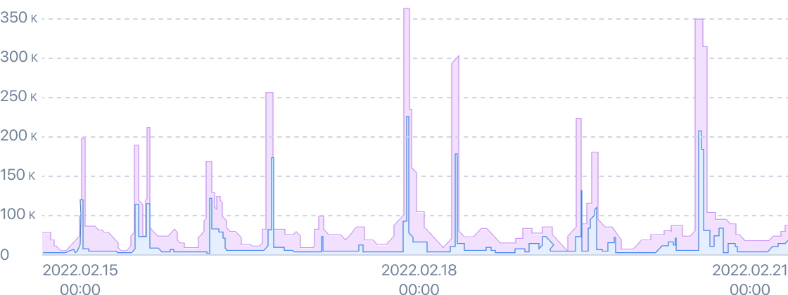 На графике показана группа зрителей, которые испытывают буферизацию. Здесь же мы видим, насколько быстрее скорость скачивания из активной P2P сети по сравнению со скоростью загрузки с CDN. На оси X цифра 1 означает одинаковую пропускную способность P2P и CDN, все остальные числа означают, во сколько раз скорость скачивания из P2P превышает скорость скачивания из CDN за одну и ту же сессию просмотра. Логарифмическая шкала.